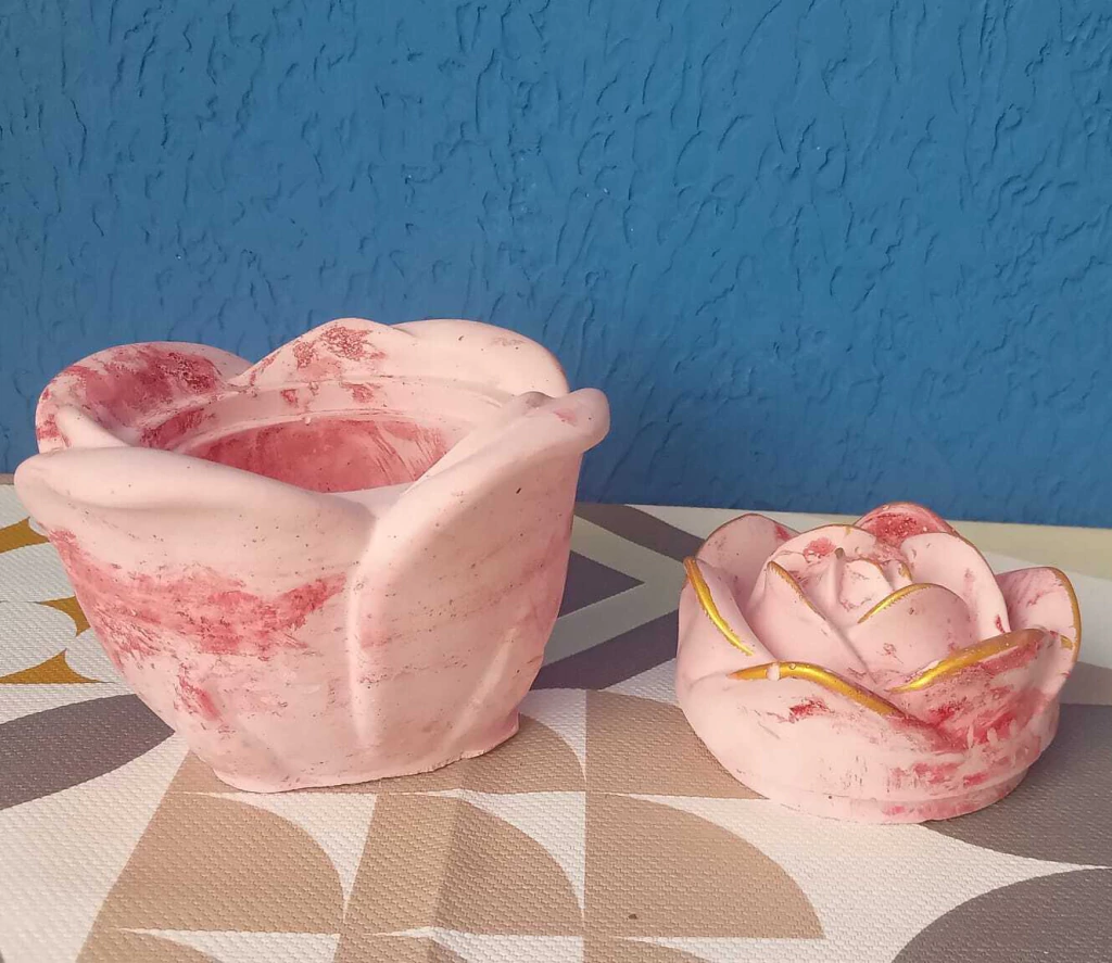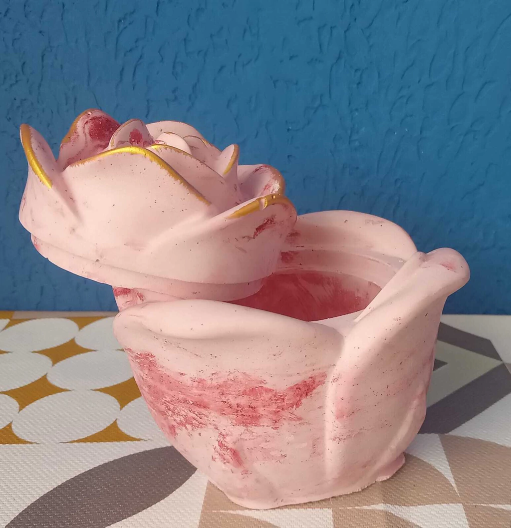 Peça artesanal em formato de flor, pintada em tons de rosa com detalhes marmorizados e acabamento dourado. Ideal para guardar joias, cristais ou pequenos objetos, trazendo charme e delicadeza para a decoração.