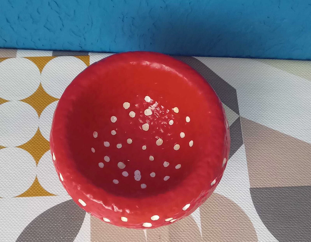 Peça artesanal em formato de cogumelo Amanita, pintada em vermelho vivo com bolinhas brancas. Além de ser um porta-objetos funcional, é também um item decorativo encantador que traz um toque mágico e divertido para qualquer ambiente.